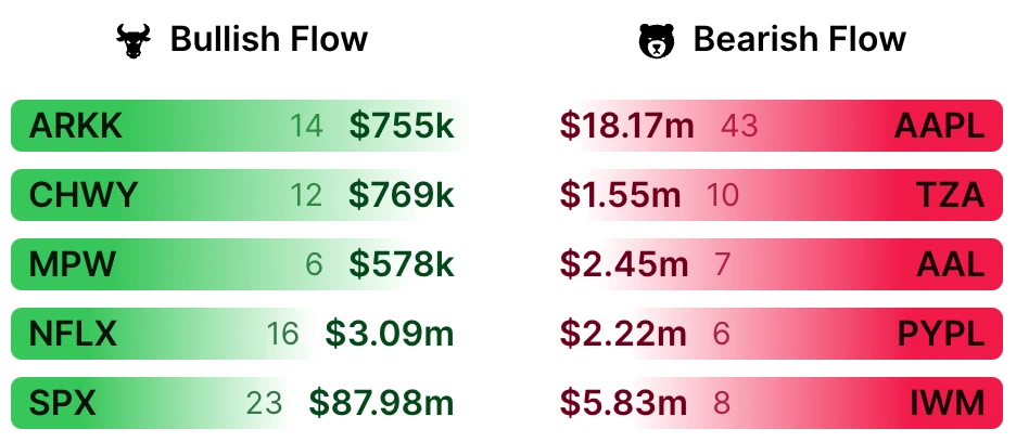 The flow summary shows the stocks with the most unusual trades for the day. The bold dollar amount is the total dollar value of the trades, and the number next to it is the total number of trades. This list is NOT sorted by either dollar value or number of trades, instead it is sorted by most unusual. This allows you to see a variety of interesting stocks, rather than the largest (SPY, QQQ, TSLA, etc) each day.