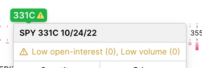 Watch out for the liquidity warning! This warning icon is displayed for options that have extremely low volume or open interest, or a wide bid/ask spread. These options don’t have much activity and can be hard to buy and sell at reasonable prices.