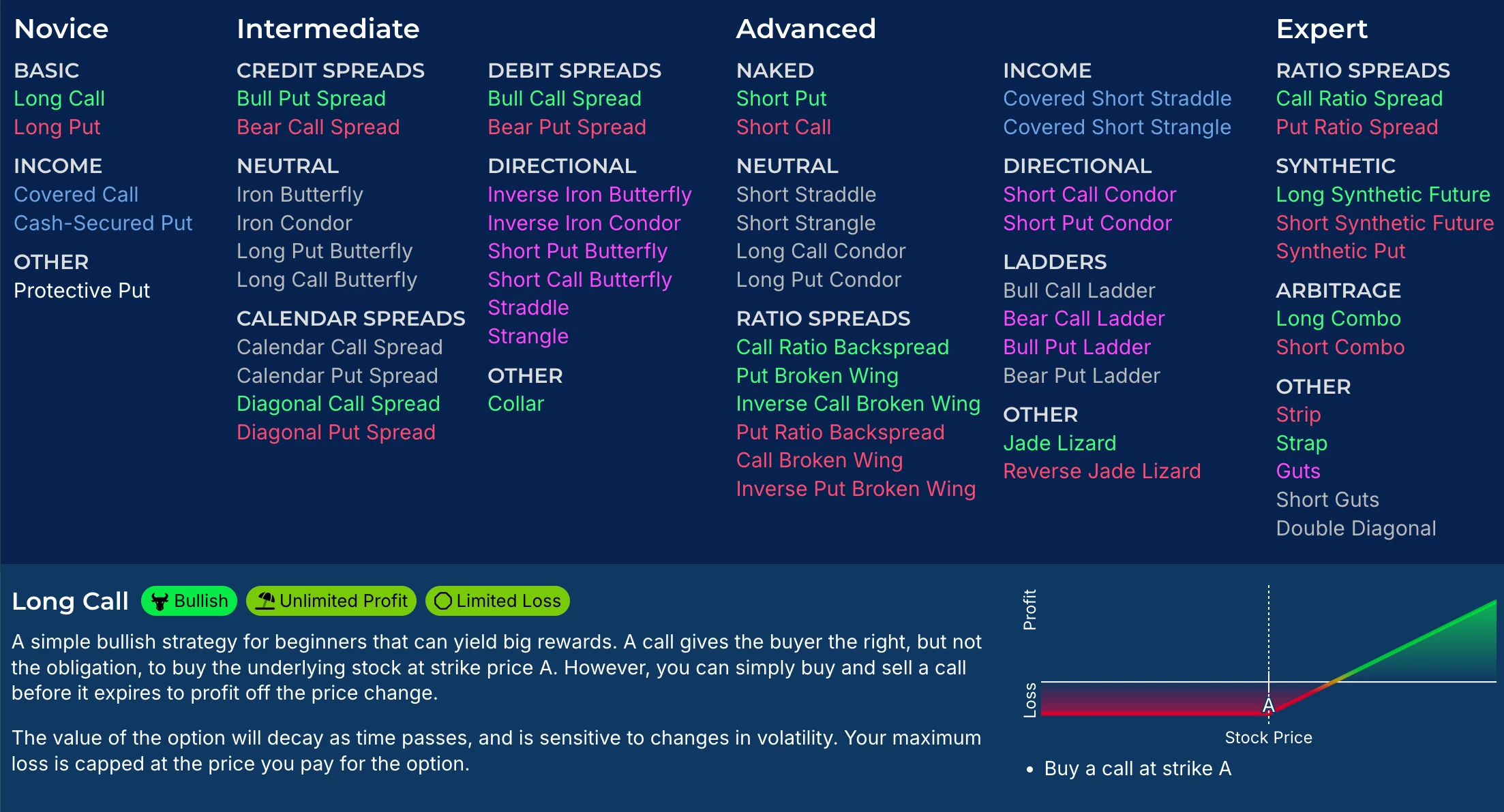 From any page you can use the menu to view the 50+ pre-made strategies. Hover over a strategy to read a short description about it and to view the profit and loss shape. This small chart shows how the stock price, represented by the X axis, affects the profit and loss, represented by the Y axis.