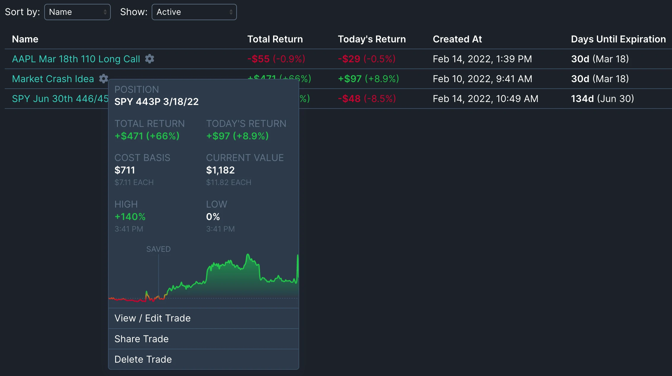 Click the save button in the top right to save the trade. You are also given the option to share the link. Saved trades will show on the saved tab and allow you to track the profit and loss of your trade over time. You can also simply copy the URL from your browser to share a trade, but it won't be added to your account unless you save it through the save dialog.