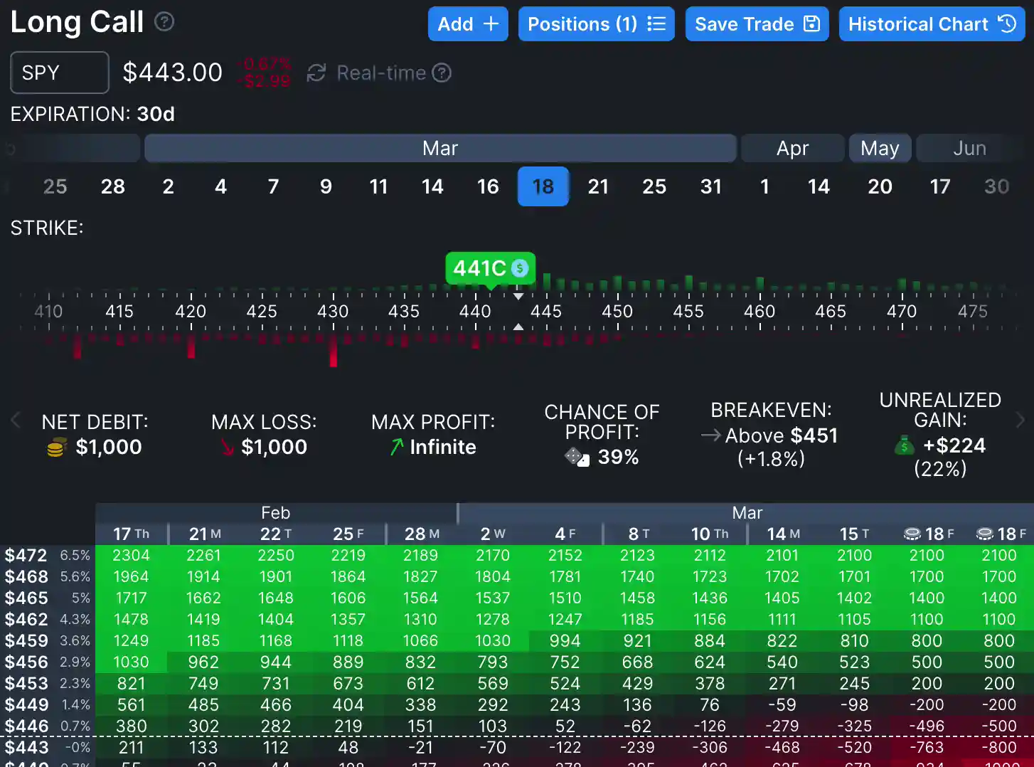 Now that your option or strategy is selected, you can view key information including the net debit (or credit), the maximum loss and profit, the breakeven prices, and the chance of profit.