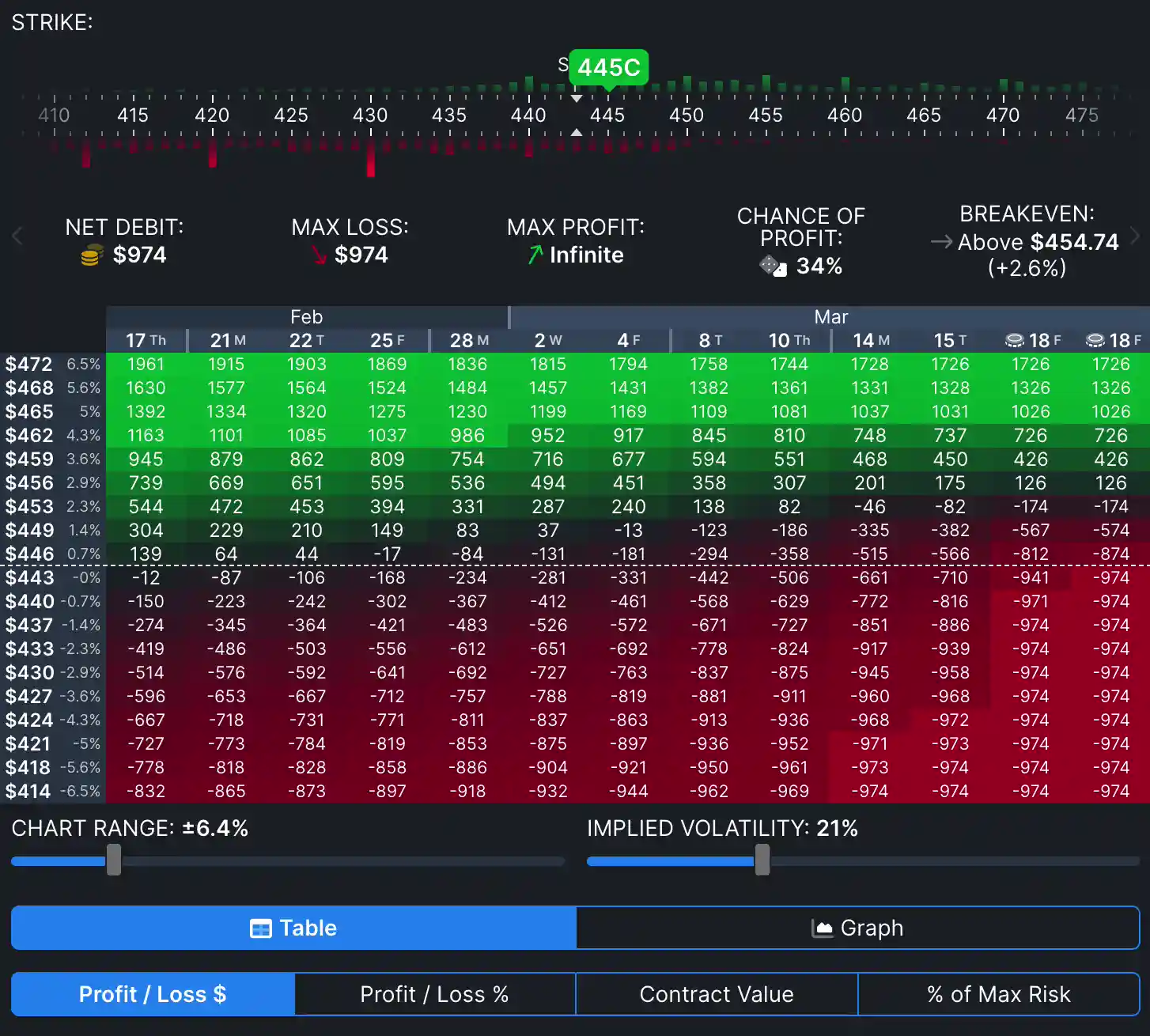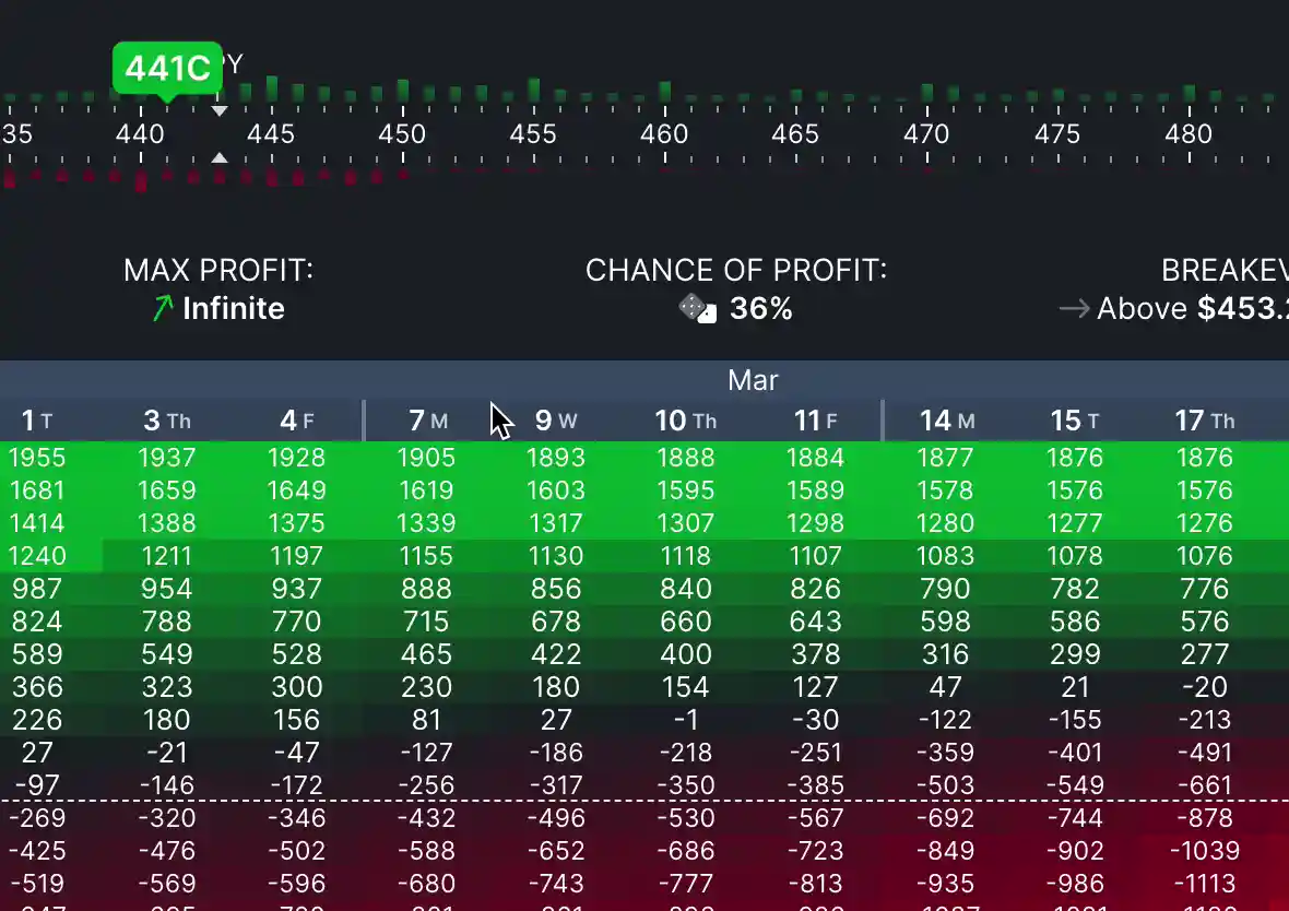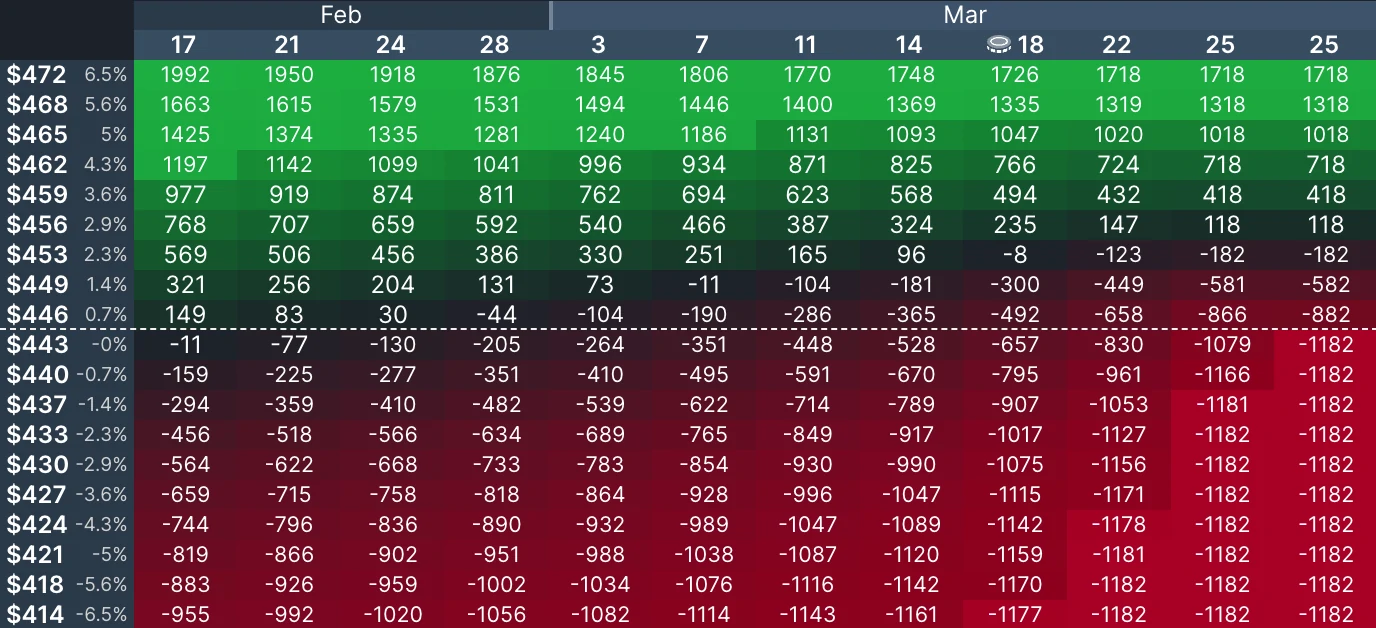 The table shows the expected profit or loss of your option(s). The rows are the potential prices that the underlying stock could be, and the columns are various dates in the future. For example, in the above image, you can see how the call will have an estimated profit of $871 profit if the stock hits $462 on March 11th.