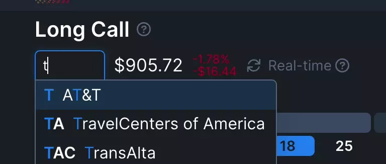 To choose a stock, type the symbol or company name to search it. Only stocks that have options are shown. Once selected, you will see the current price of the stock and the available options. (If you are searching for a futures option, add a slash before the symbol, such as /ES)