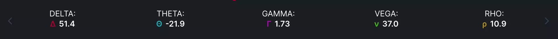 - Greeks: Swiping to the second page of stats shows the net option greeks, which are the combined greeks for all options in your strategy. Refer to any basic options tutorial to learn more about the greeks.