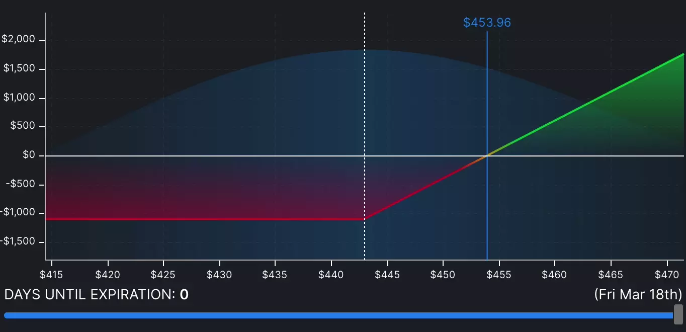 The chart is a similar method of viewing the profit and loss, but it only shows one day at a time. Use it if you want to get a closer look at the various potential prices for a day. The X axis is the potential price of the underlying, and the Y axis is the profit/loss at that price. Drag the "Days Until Expiration" slider to change the day, and move your mouse over the graph to show the exact profit/loss at a point. The blue line represents the breakeven price.