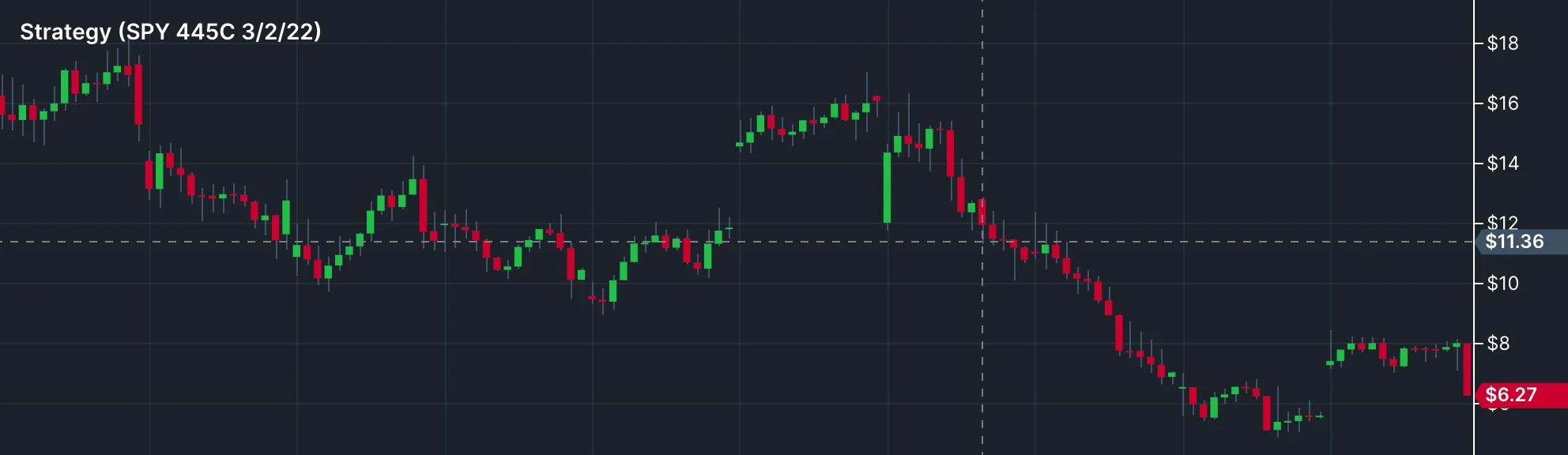 Note: The price history shown is the price of the option contract itself, not the profit or loss (as you didn't have any position or cost-basis in the past). We also show the price as the smallest unit possible, meaning if you have an option with a quantity of 10, we show the price as a quantity of 1. This is to help you when placing orders, since you place a limit order for the price of a single option contract, not the total price. Additionally, candlestick charts can only be shown for single-option strategies. (Since the high/low point of each leg may not be at the same time with multi-leg strategies)